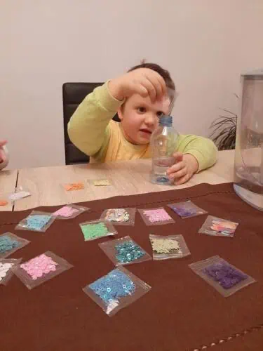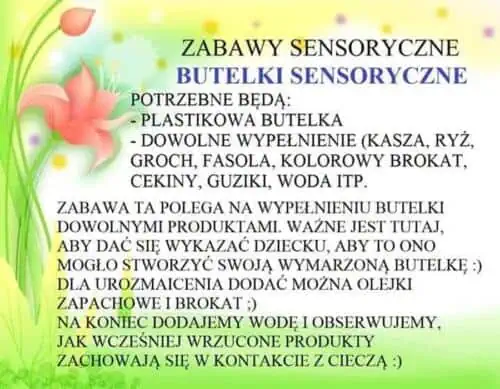 Strona główna » Aktualności » Butelki sensoryczneButelki sensoryczne“Jeżyki ” w warunkach domowych za pomocą cekinów, grochu itd wykonują butelki sensoryczne. Super zabawa. DalejNiepełnosprawność