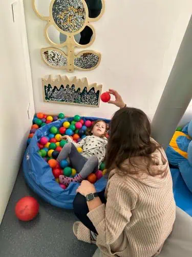 Logopedia z Madzią. Poznajemy się, nawiązujemy relację, śpiewamy dużo bo Madzia lubi śpiewać. Uczymy się patrzeć na te same zabawki.